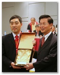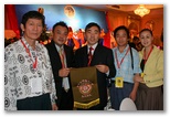 在关林庙前的关林国际朝圣大典现场,关公网站将一部依照清代皇家规制镌刻的《关帝圣迹图志全集》金卷赠送给台湾桃园明圣经推广学会。左起:关公网站长关公后裔关志杰,台湾桃园明圣经推广学会理事长黄国彰先生和他的会员。