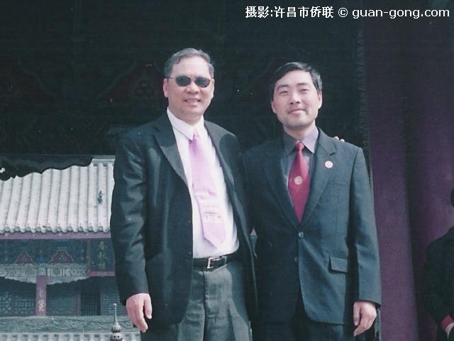 世界关氏宗亲总会关健中主席(左)和关公网站长关志杰在春秋楼前合影留念